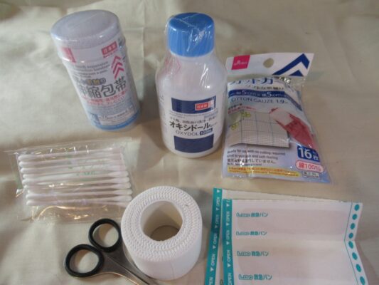 バイク用に特別なものはありません。キャンプなら標準的な包帯やオキシドールなどです。