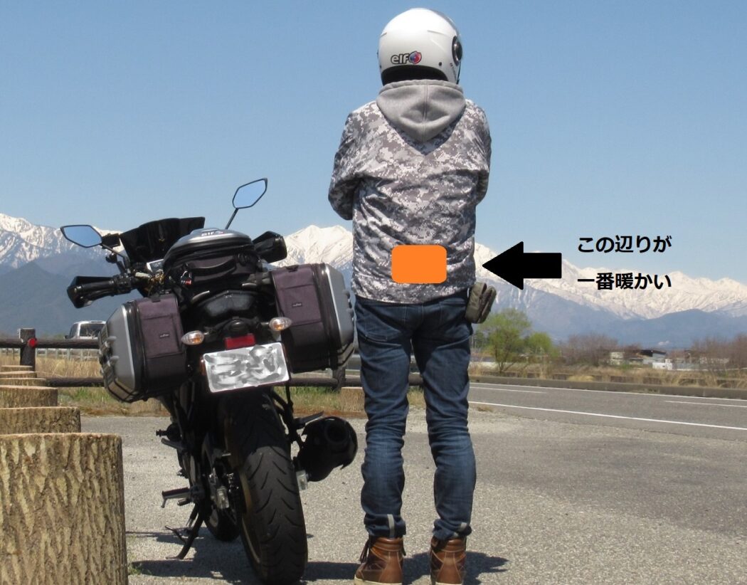 手指の冷えは電熱グリップや電熱グローブで防げますが逆に腰回りの冷えが辛くなります。