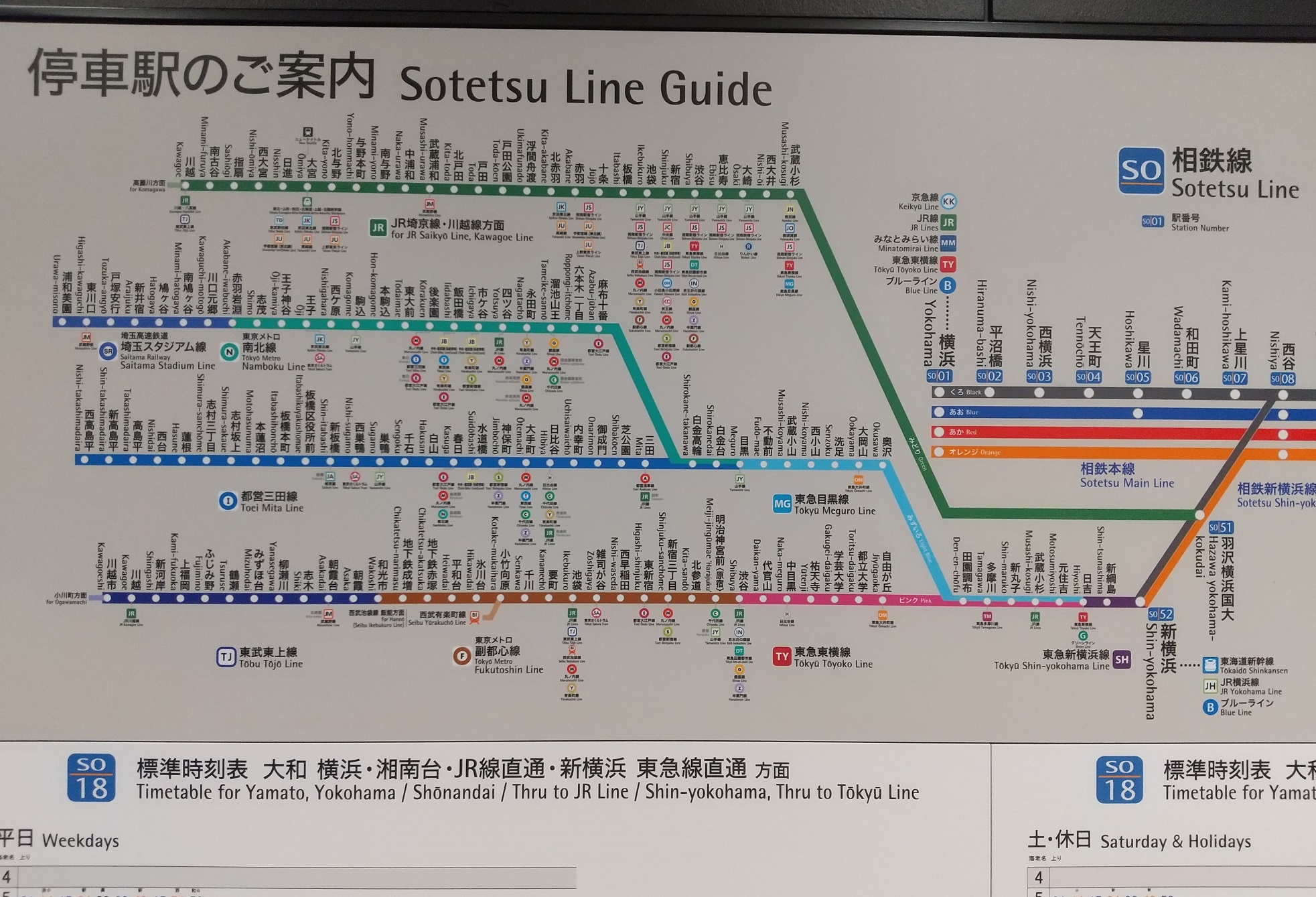 ところが2019年11月から新路線。西谷駅から分岐してJRと東急との相互乗り入れです。海老名駅からも横浜駅を経由せずに直接都内や埼玉に行けることに。(停車駅の案内板も凄いことに)