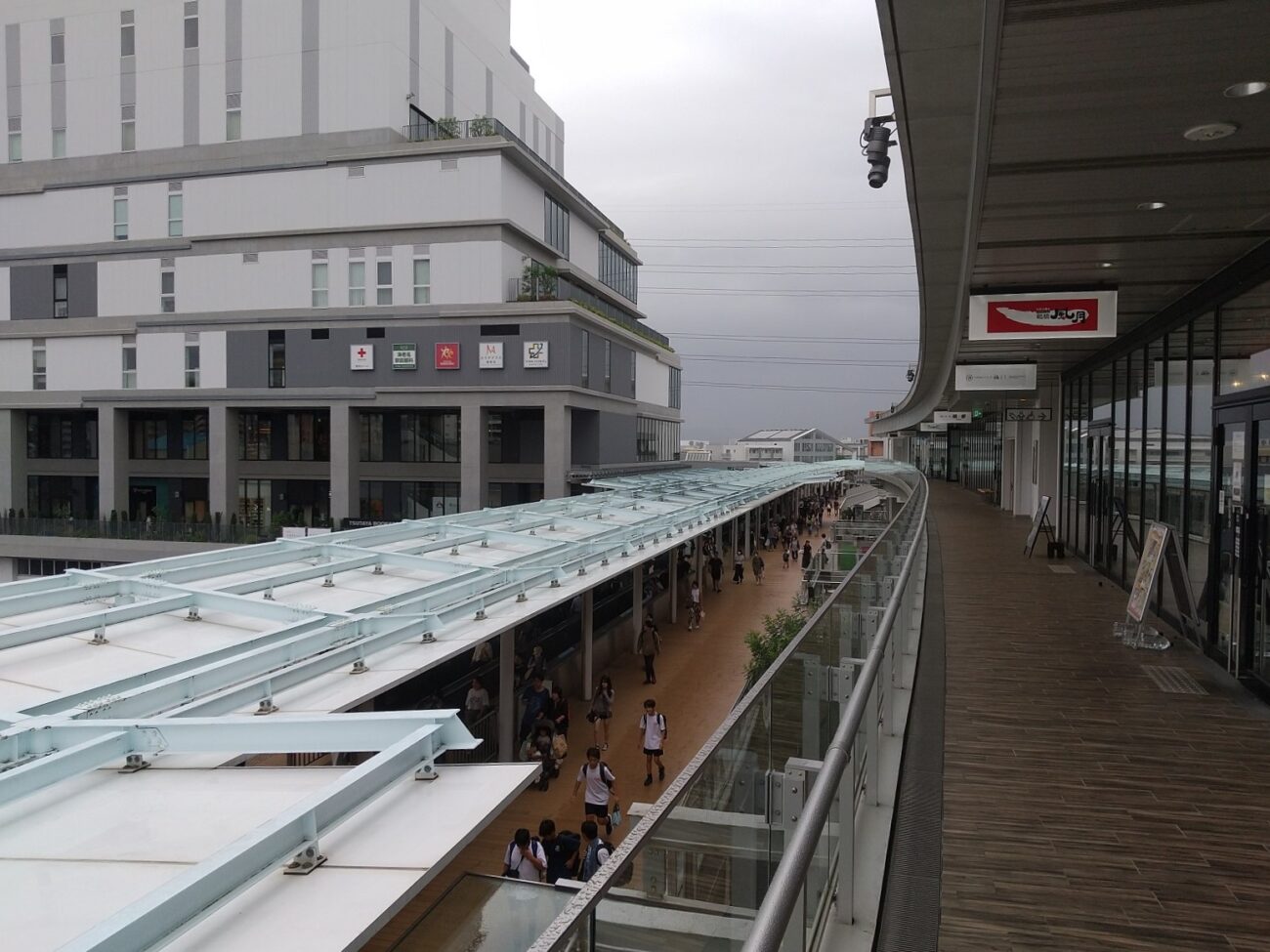 高層ビルの間に設置されたペデストリアンデッキは小田急・相鉄の海老名駅から屋根付きなので雨でも大丈夫。