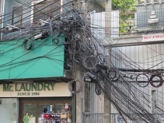 この状況で新規の配線や停止とか管理できていると思うと逆に凄いですね。東南アジア各国の住宅密集地でも似た状況です。