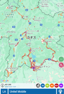 首都のビエンチャンは5Gの紫色でも首都を離れると4Gで3Gも。ビエンチャン以外に行くと厳しい感じですね。