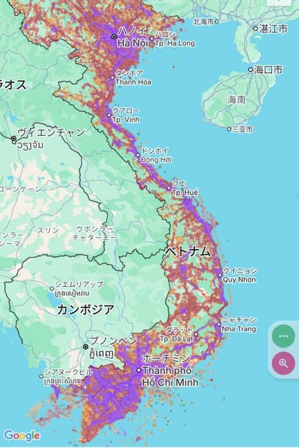 今度はベトナムです。ハノイとホーチミンはほぼ紫色の5Gです。