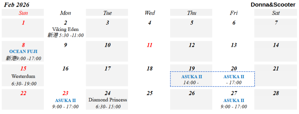 客船入港スケジュール 2026年(令和8年)2月