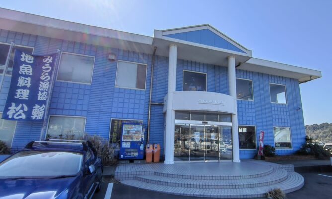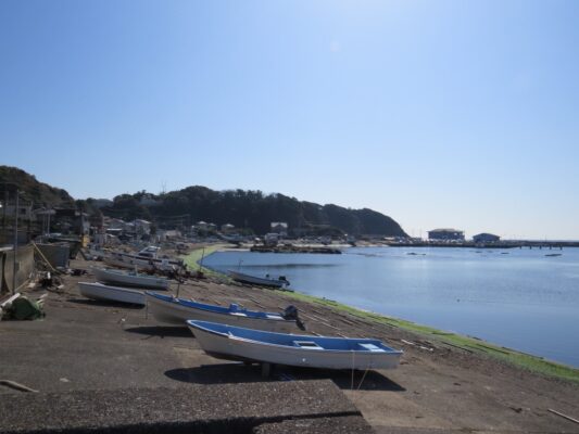 のどかな江奈湾に到着です。手前の浜辺には漁船、右手奥には目指す地魚料理松輪と漁協の建屋が見えます。