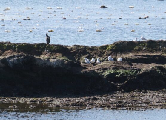 湾の中に浮かぶ小島にはウミウや冬鳥のウミネコのような鳥がのんびり日光浴。