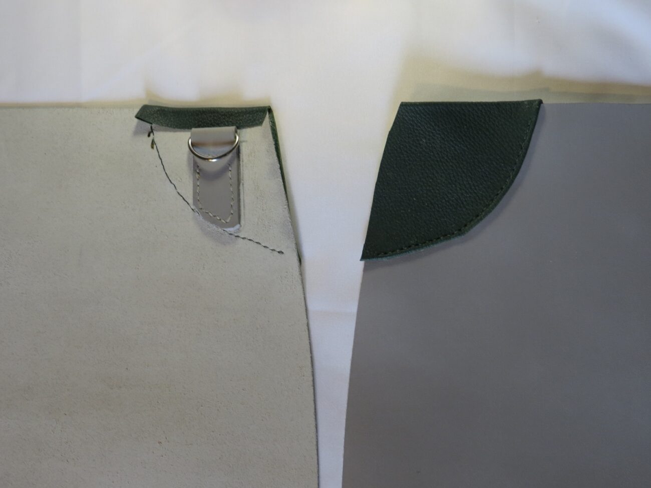 銀面側にDカンの革の縫い糸が見えるのでアクセントの緑革で隠してます。