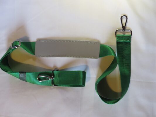 ショルダーベルトはAmazonで購入した明るい緑色のアミテープです。柔らかくつるつるしたナイロン素材でナスカン付き。革のベルトにこだわる必要がなければ製作時間もぐっと短縮できます。