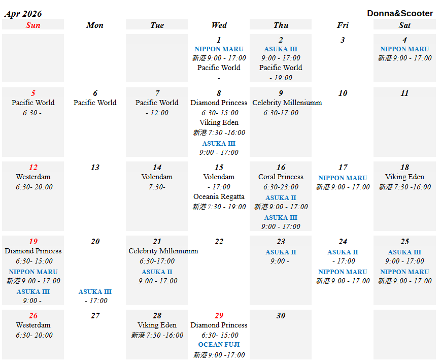 4月の横浜港の入港スケジュールです。延べ29隻もの大型客船が入港です。