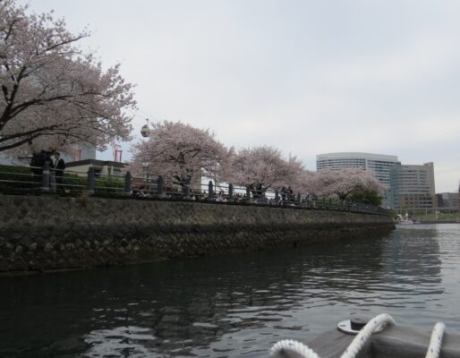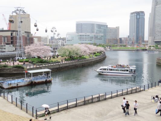 さくら通りから汽車道を歩いて出発場所のピアがある運河パークに向かいます。横浜らしい春の景色です。