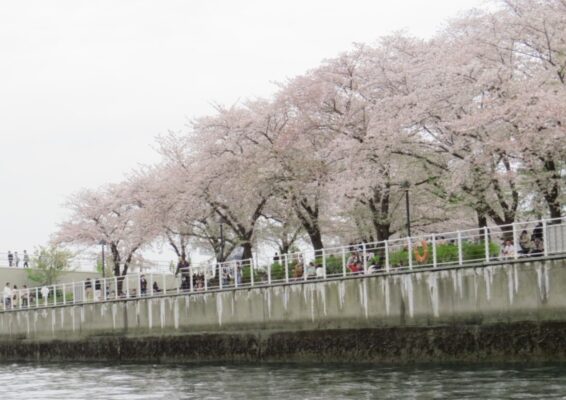 反対側は万葉倶楽部の前の満開の桜。ボートを停止して撮影タイム。