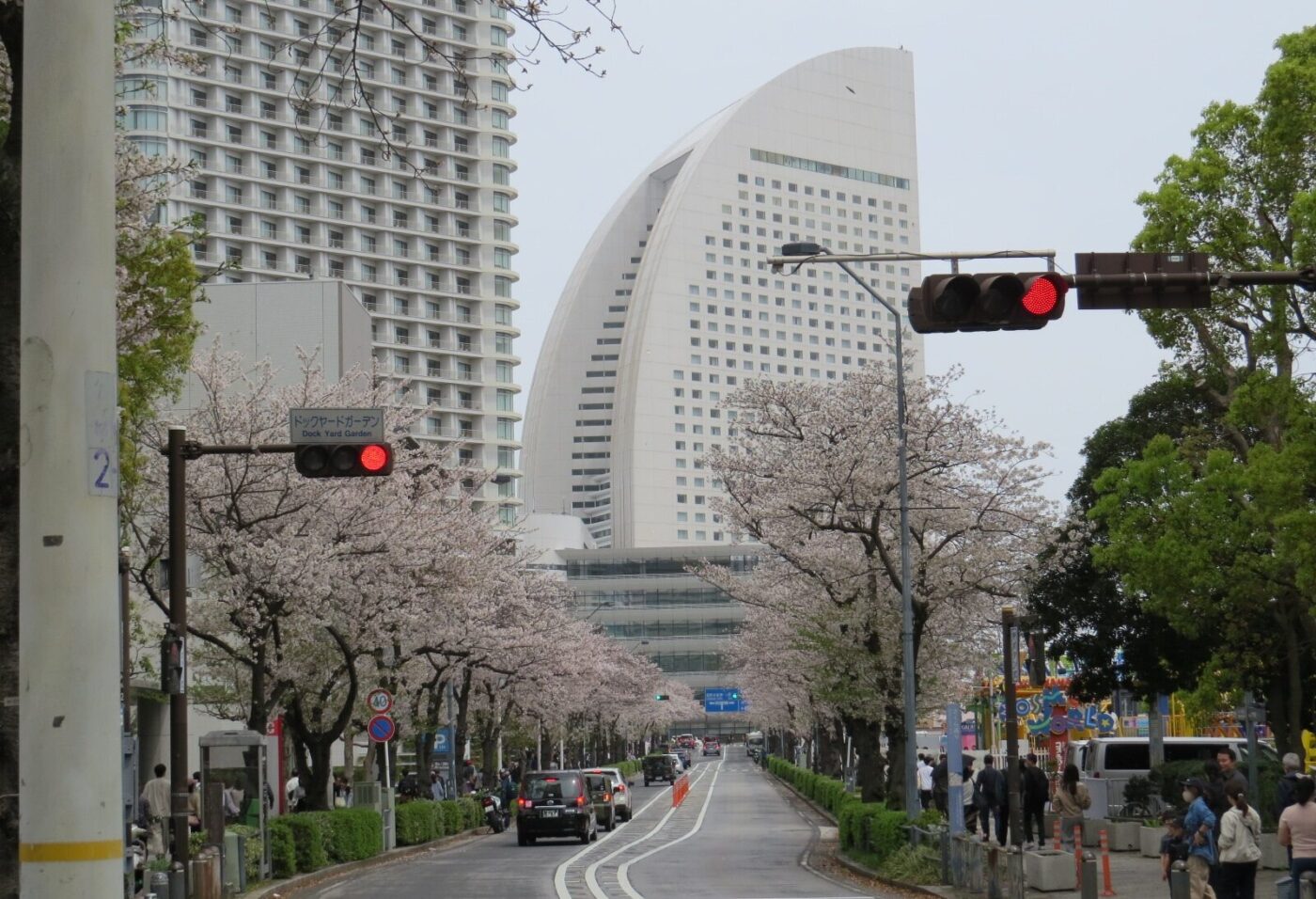 左手に汽車道の桜並木を右手にアニヴェルセルとコスモクロックを仰ぎ見ます。
