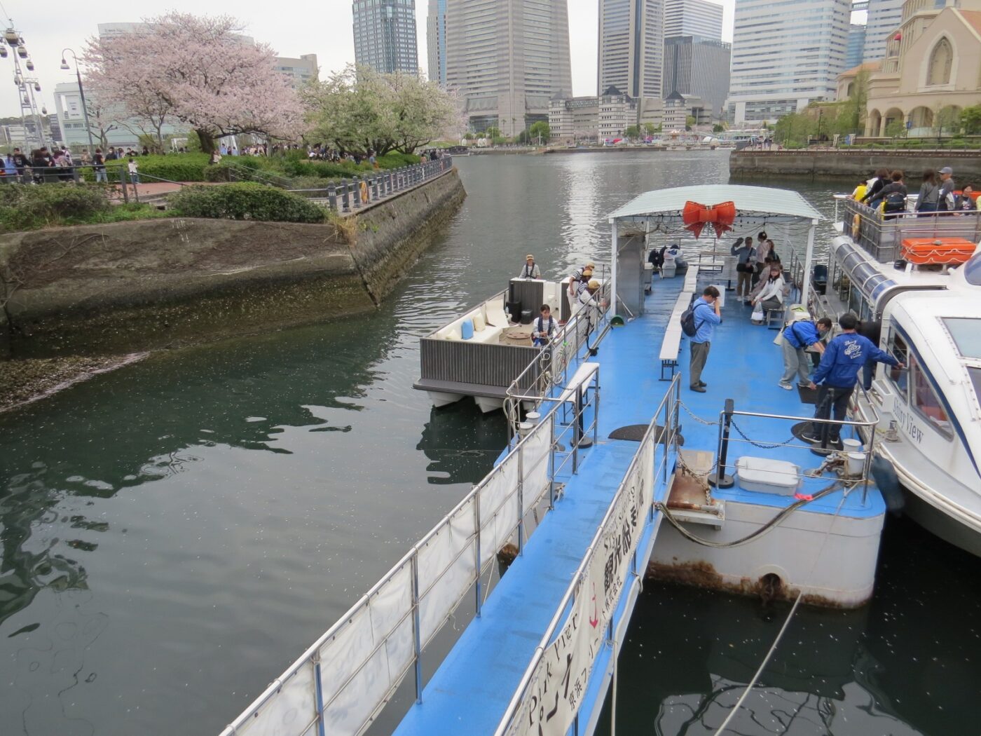 さくら通りから汽車道を歩いて出発場所のピアがある運河パークに向かいます。横浜らしい春の景色です。