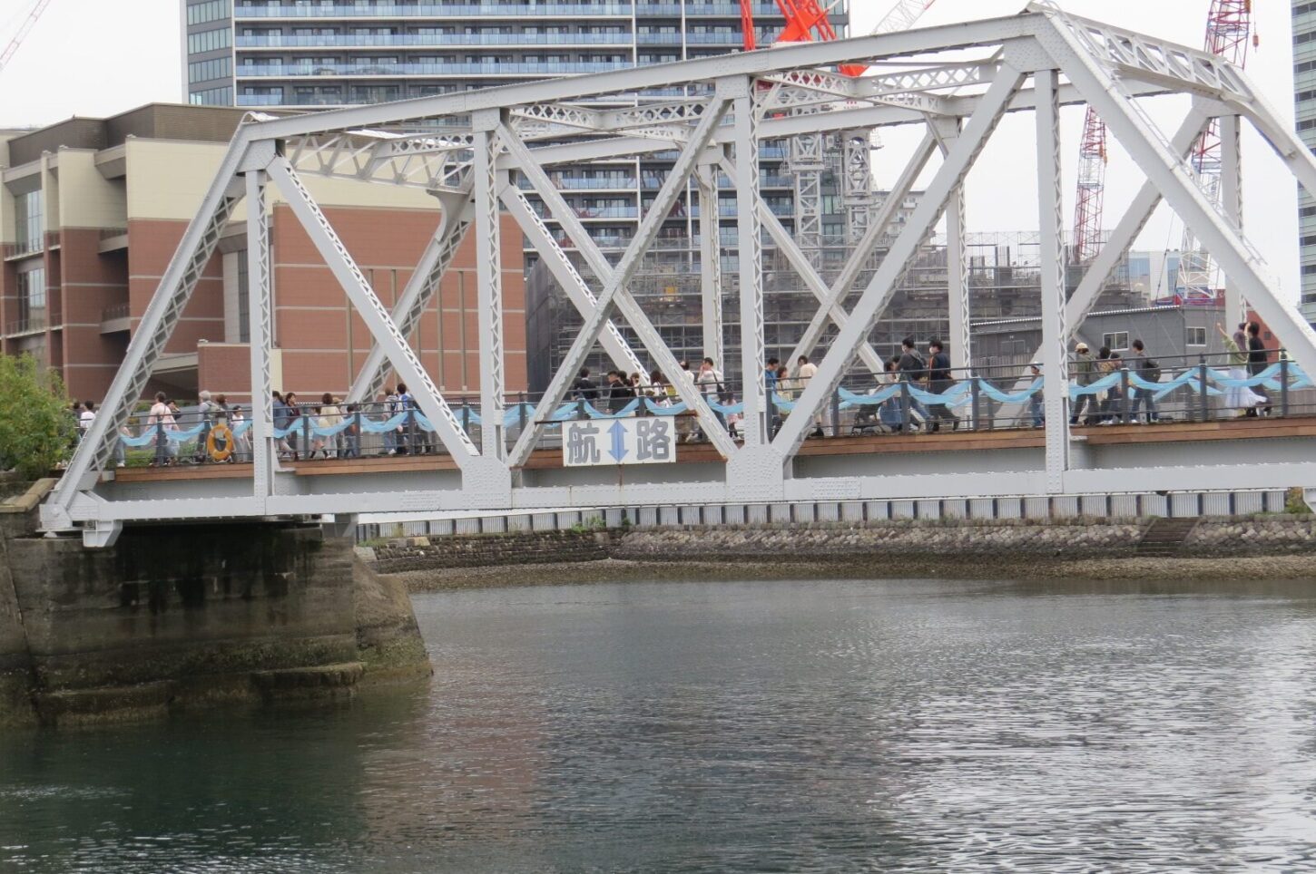 汽車道にかかるトラス橋をくぐってノートルダム横浜側の運河に移動。